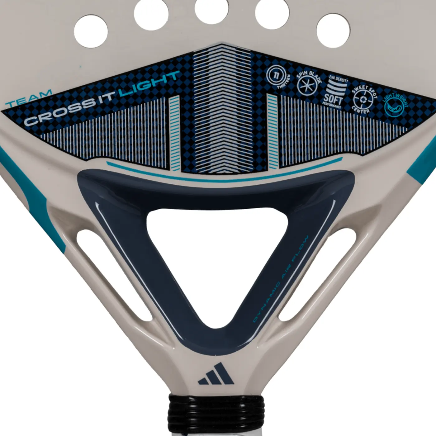 The ADIDAS PADEL RACKET 2025 CROSS IT TEAM LIGHT stands out within the CROSS IT range as a lightweight innovation that doesn’t compromise on essential performance features. With the Power Extra Grip and 11 Thirteen hole arrangement, it effortlessly delivers powerful shots when needed. Incorporating Dynamic Air Flow technology, this racquet features open holes that reduce air resistance, promoting quick manoeuvres and allowing players to react swiftly in fast-paced situations. The Spin Blade Decal adds another layer of precision, maximising control and spin for confident shot execution. Its lightweight design offers exceptional comfort during technical movements, helping players maintain agility on the court. Made from fibreglass and low-density EVA rubber, it offers a soft touch and increased comfort, enhancing the overall playing experience.