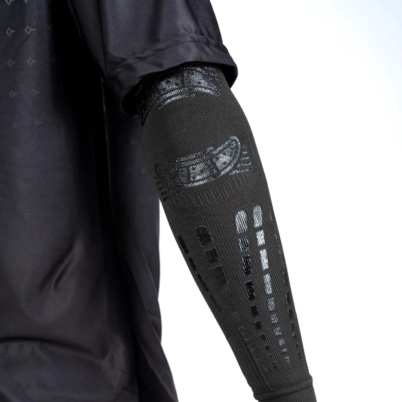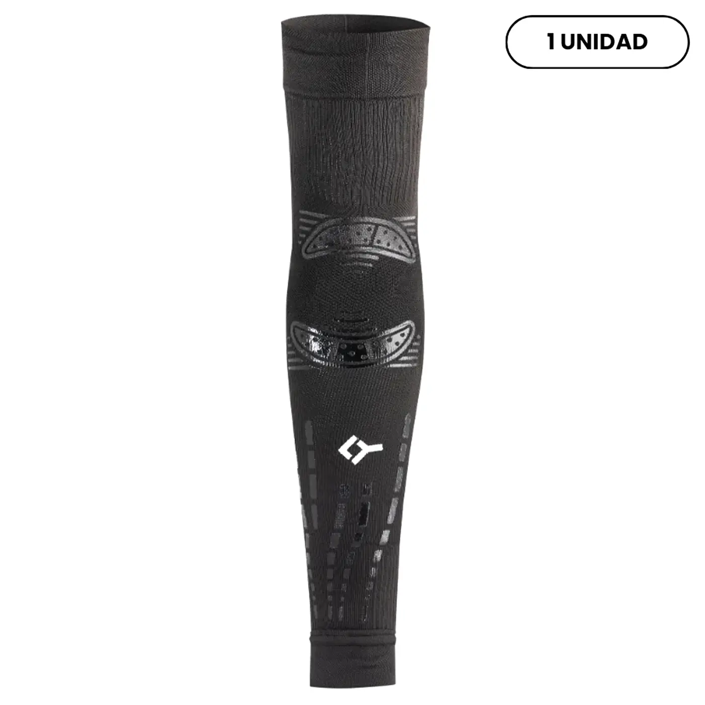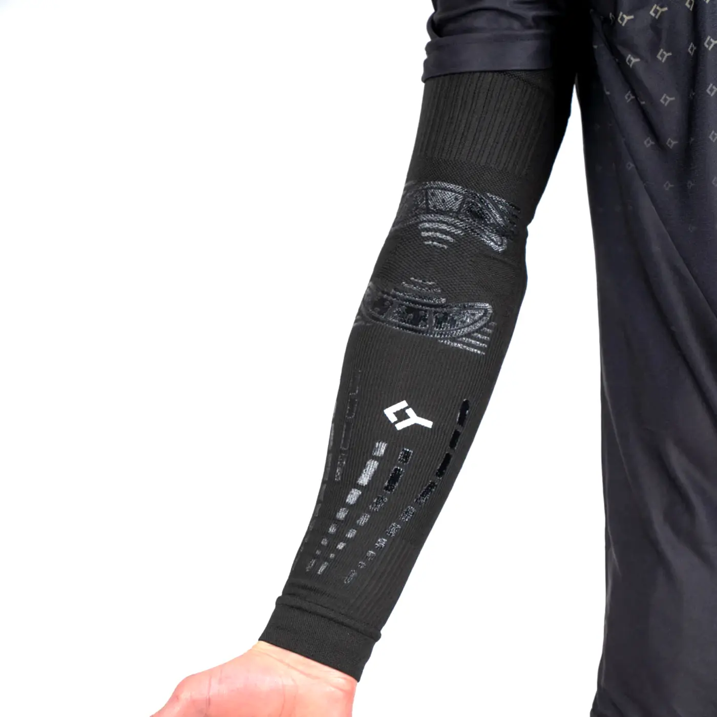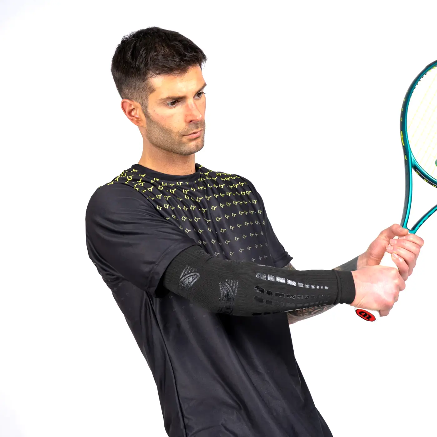 The sleeve is built with a high-performance blend of polyester, polyamide, and elastane for elasticity and durability. External silicone applications follow the muscular anatomy of the forearm to enhance vibration absorption and stability. The breathable construction ensures comfort during extended play.