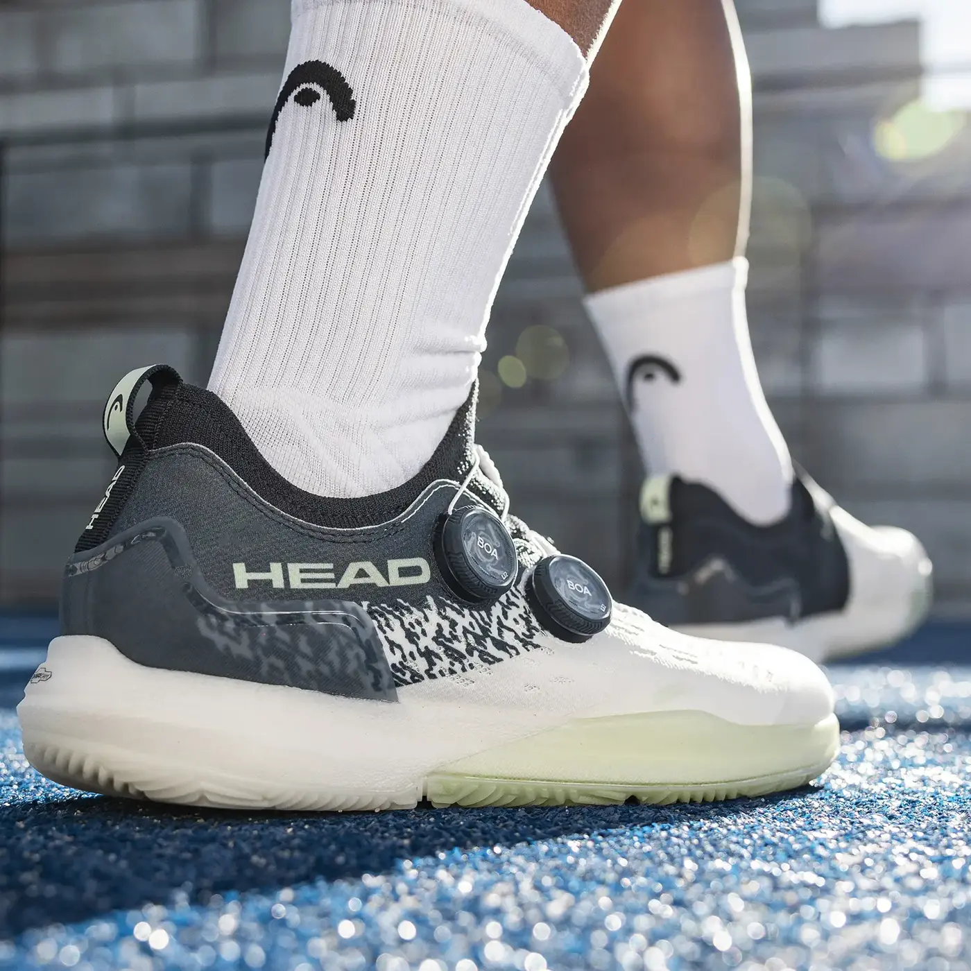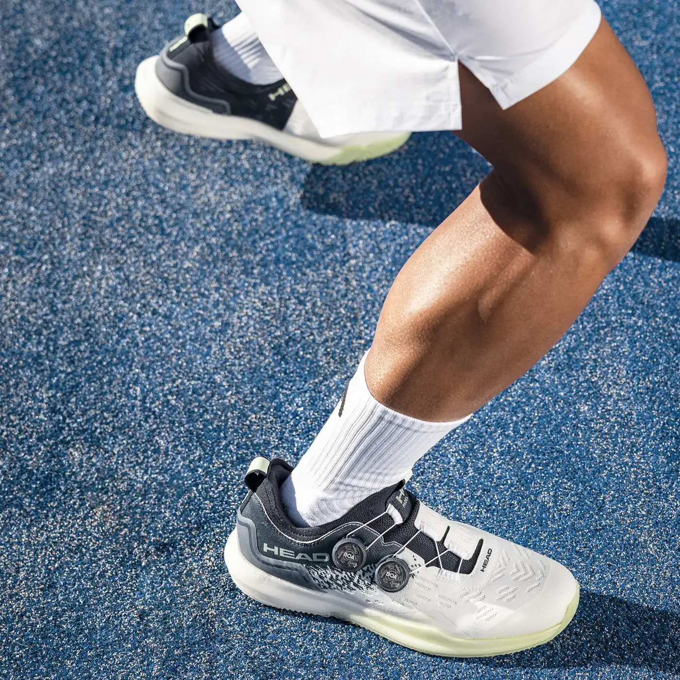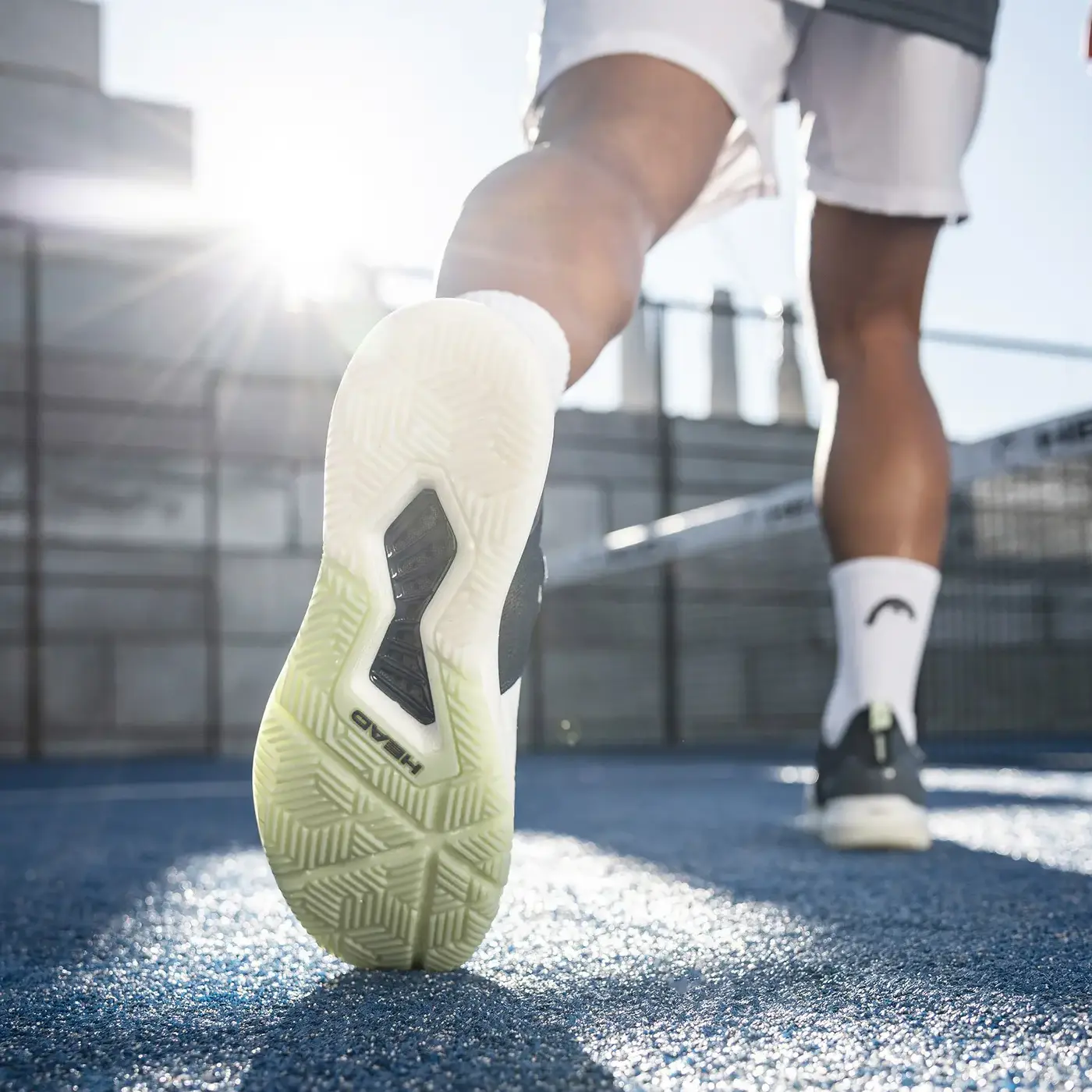 The padel-specific outsole, developed in collaboration with MONDO, allows smooth 360-degree movement on different padel turfs. Drift Defense technology with a TPU toe cap protects against abrasion during slides, while the integrated cooling system ensures continuous ventilation throughout the match. Finished with a premium, modern HEAD design, these shoes combine elite performance with refined style.