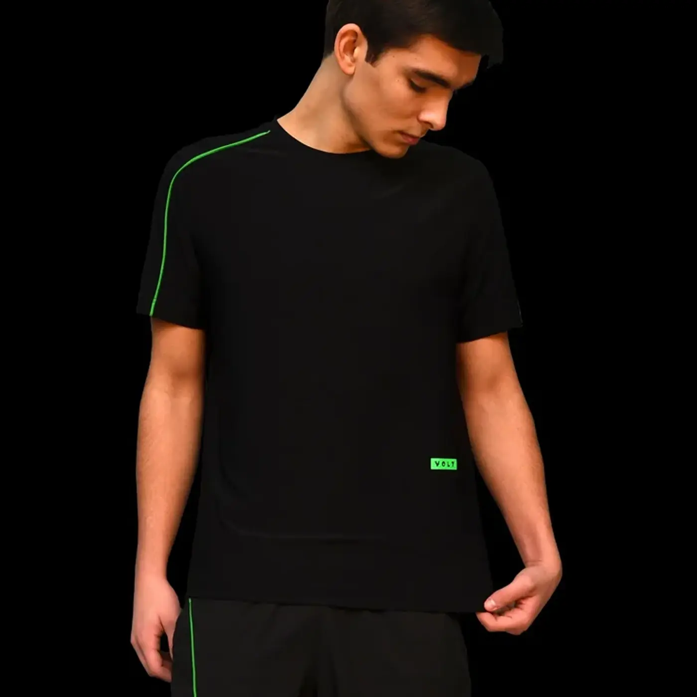 VOLT Performance Padel T-shirt Black Green is designed for training and match performance with soft breathable dry-fit fabric. Made with stretch polyester blend, it delivers moisture management and freedom of movement. The lightweight construction keeps you comfortable while maintaining an athletic fit for padel sessions.